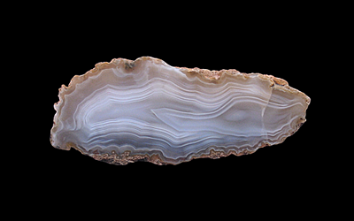 AD-198 Agate SOLD Amerzgane, Ouarzazate Province, Drâa-Tafilalet Region, Morocco 10.4 x 4.5 x 5.0 A blue-grey & white-hued Agate that exhibits a great parallax. This specimen could easily be mistaken for a Laguna Agate, that's how strikingly it “winks”. A parallax is an effect which is sometimes referred to as “winking”. When a banded Agate forms with close alternating opaque and transparent bands, the light entering the Agate can cast an observable shadow from one opaque band onto the next. As the parallel bands change their perceived angle, the appearance of movement and perception of depth occur. The finer the banding, the more striking this effect is.