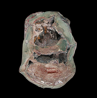 AD-184 Agate & Quartz Thunderegg SOLD Lierbach Valley, Oppenau, Black Forest, Baden-Württemberg, Germany 19.5 x 14 x 6.4 cm Here we have a very large example of Agate from Germany's Black Forest. The center of this slate-green-colored Agate is filled with Quartz crystals. The two chambers of this Agate have sparkling Quartz crystals and a red-colored mineral, most likely Hematite. There are many Agate localities all over Germany, but few Agates ever make it to the United States.