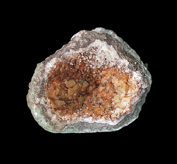AD-247 Barite geode (fluorescent) $45 Giralia Range, Carnarvon Shire, Western Australia, Australia 7.8 x 5.3 x 4.5 cm This septarian nodule hails from the Giralia Range, near the western coast of Australia. This specimen features numerous red-orange-colored crystals of Barite. Septarian nodules contain angular cavities or cracks, called “septaria”. This word comes from the Latin word septum, meaning partition. The cavity of this specimen exhibits strong yellow-white fluorescence under both LW and SW illumination.