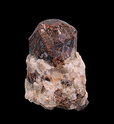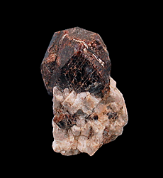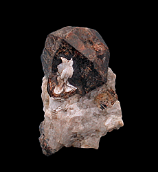 G-171 Almandine with Cleavelandite on Quartz & Albite $60 Southern Pacific Silica Quarry, Nuevo, Lakeview Mountains, Riverside County, CA 4.3 x 3.1 x 2.4 cm A crystal of almandine with a small group of cleavelandite crystals embedded in its side perched on pegmatite matrix. The matrix of this specimen consists of quartz, albite and muscovite. There are also several smaller garnets embedded in the matrix. The almandine crystal measures 2 x 2 x 2 cm and is complete with only a small area of contacting where it formed against another Garnet. Specimens from this location are seldom seen and are highly prized by collectors of Southern California pegmatite minerals. This location is on private land has been closed to collecting for a number of years now.