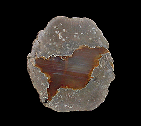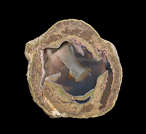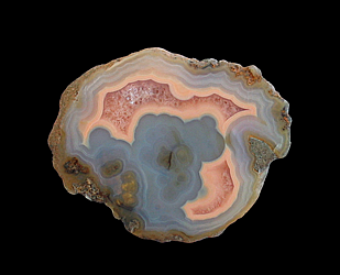 Hauser Beds, Thumb Peak, Palo Verde Mountains, Imperial County, CA 8.5 x 8.2 x 3.4 cm This lithophysae agate from California's Hauser Beds features a brownish-colored center with faintly pinkish highlights. The chalcedony core is surrounded by a thin line of reddish-pink agate as well as several bands of moss-green. Classic, older material that agate & thunder-egg collectors hold in high regard.