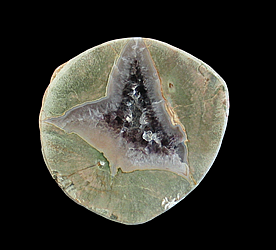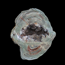 Valley, Oppenau, Oberes Renchtal, Ortenaukreis 8.7 x 7.6 x 3 cm A lithophysae agate from Germany's Black Forest. The center of this slate-green agate is filled with quartz crystals. The vug in the lower-center portion of the nodule has smaller quartz crystals and is outlined by a red-colored mineral, most likely hematite.