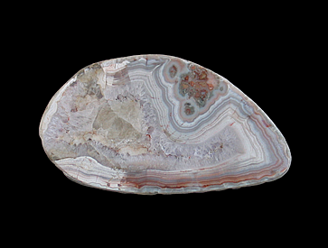 AD-268 Agate with Quartz & Hematite $50 Nowy Kosciól, Gmina Swierzawa, Zlotoryja County, Lower Silesian Voivodeship, Poland 9 x 7.6 x 4.3 cm A lithophysae nodule (thunder egg) from south-western Poland with bands of blue-grey agate accented by spots of dark-red hematite. The center of the agate has small vug filled with tiny quartz crystals.