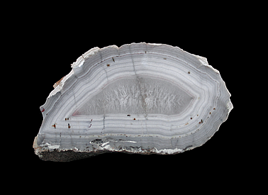 AD-256 Agate with Quartz, Goethite& Hematite $75 Juchem Quarry, Niederwörresbach, Herrstein-Rhaunen, Birkenfeld, Rhineland-Palatinate, Germany 11.2 x 6.2 x 5.3 cm This agate features finely banded layers of various shades of gray with a core of quartz which is accented by by faintly red inclusions of hematite. The dark specks are due to inclusions of goethite.