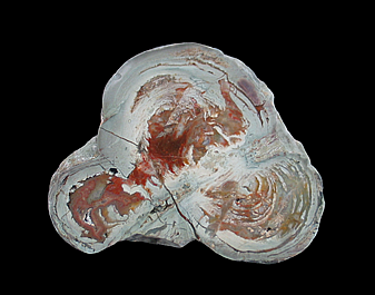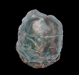 Valley, Oppenau, Oberes Renchtal, Ortenaukreis 8 cm x 6.3 cm x 2.8 cm A lithophysae agate from Germany's Black Forest. This specimen exhibits several shades of green accented by patches of brick-red hematite. There is also a patch of off-white quartz present in the upper center and as a filling in several cracks on the right portion of the specimen.