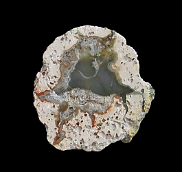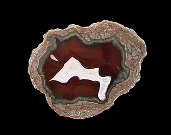 Valley, Oppenau, Oberes Renchtal, Ortenaukreis 8.5 x 8.3 x 3.3 cm A lithophysae agate from Germany's Black Forest. This nodule features green and white agate as well as several vugs filled with quartz crystals. The vugs are outlined by a red-brown hematite.
