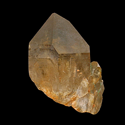 Q-623 Citrine with Malachite $60 Quartz occurrence, Luena, Haut-Lomami, DR Congo 5.2 cm x 3.7 cm x 3.7 cm A mostly clear golden-hued crystal of quartz with numerous smaller quartz crystals at its base. The smaller crystals are accented by a coating of sparkly, green-colored malachite.