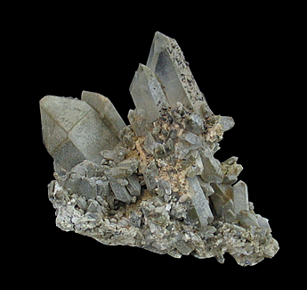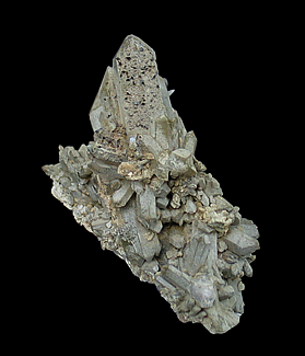 Q-629 Quartz with Cookeite $150 Bennett Quarry, Buckfield, Oxford County, Maine, USA 11.3 x 12.1 x 5.9 cm A large group of doubly terminated quartz crystals exhibiting parallel growth accented by patches of silvery-green cookeite.