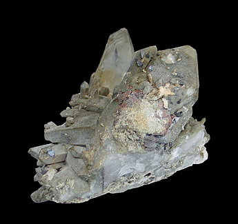 Q-634 Quartz with Stilpnomelane & Chlorite $50 Landsverk 1 Feldspar Quarry, Landsverk, Evje og Hornnes, Agder, Norway 9.8 x 6.7 x 4.4 cm A group of several quartz crystals with a thin coating of chlorite and patches of brownish stilpnomelane.