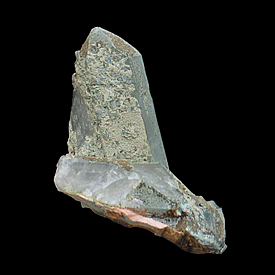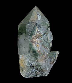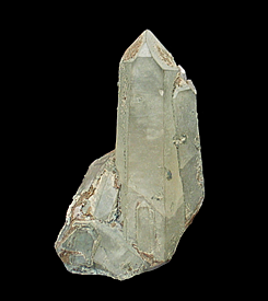 Q-628 Quartz with Chlorite inclusions $50 Schin gorge, Grisons, Switzerland 6.5 x 3.9 x 2.4 A translucent crystal of quartz with inclusions of dark-green chlorite that has been overgrown with transparent quartz.